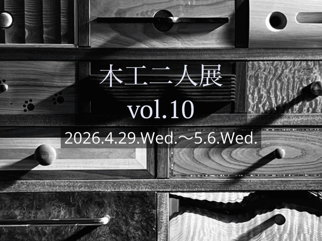 「木工二人展 vol,10」 会期:2026年4月29日(水)~5月6日(水) 開場時間:9時~17時(最終日は15時閉場) 会場:蔵シック館 (長野県松本市中央2-9-15)